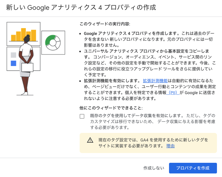移行はGoogle AnalyticsでGA4のプロパティを追加してからダッシュボードの詳細設定を行うだけ。