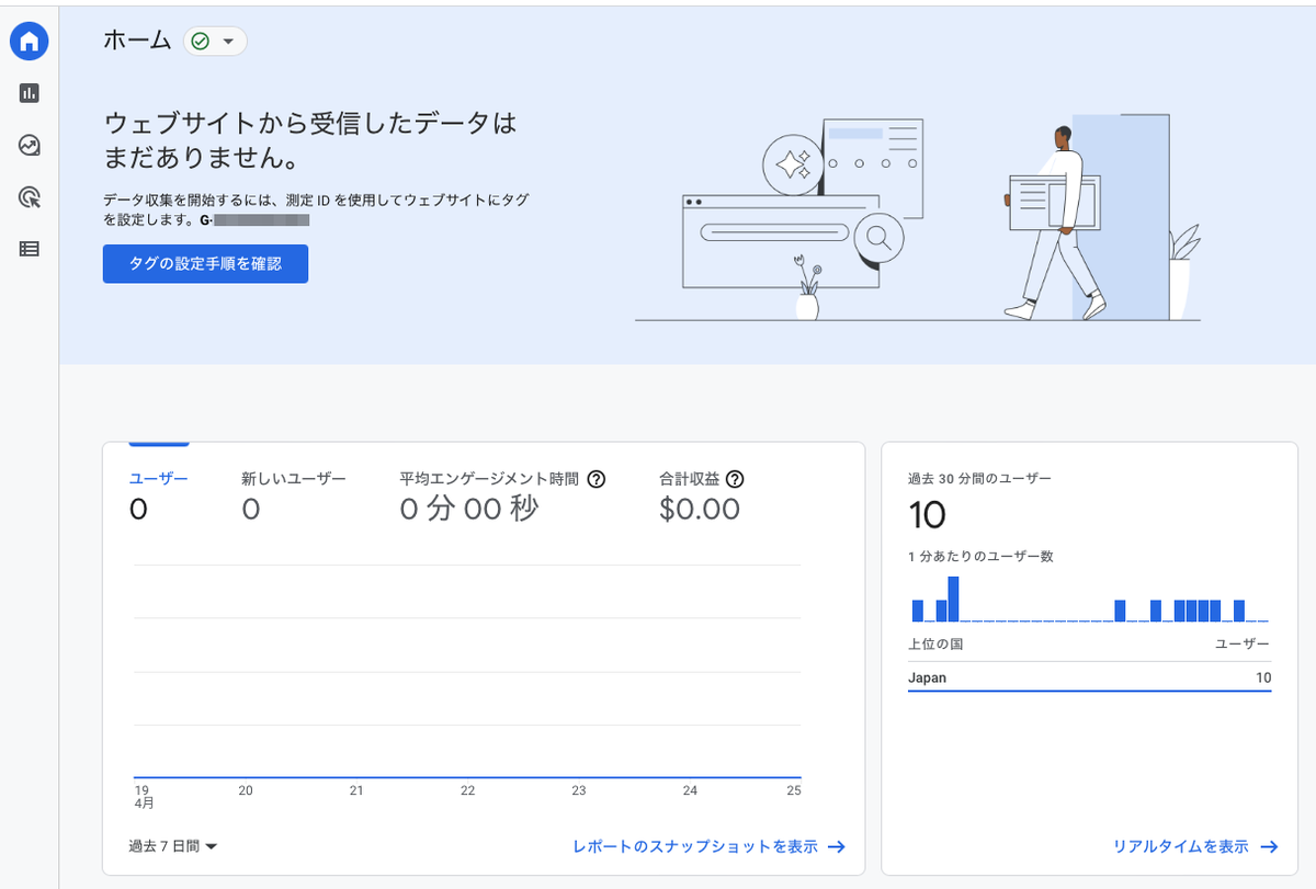 GA4プロパティのホーム画面を表示すると「ウェブサイトから受信したデータはまだありません。」の表示は出ますが、過去 30 分間のユーザー数の表示が始まっていることが確認できます(表示の反映までは個人差がありそうです)。