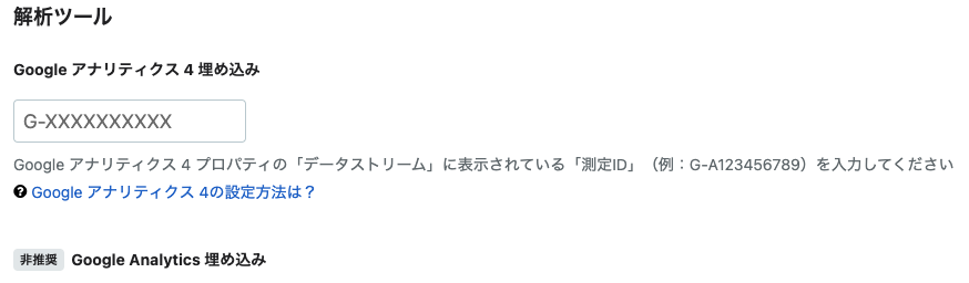 ダッシュボード管理画面の「設定」-「詳細設定」を開き、「測定ID(G-*************)」を入力するだけの簡単設定となりました。
